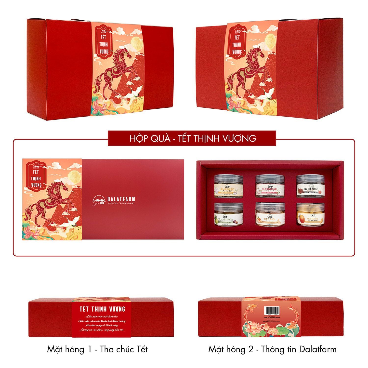 Hộp Quà Tết Thịnh Vượng (Hộp Đỏ) (Trà Lài - Trà Sen - Trà Đen - Mứt Vỏ Bưởi Chanh Dây - Hạt Điều - Xoài Sấy Dẻo)